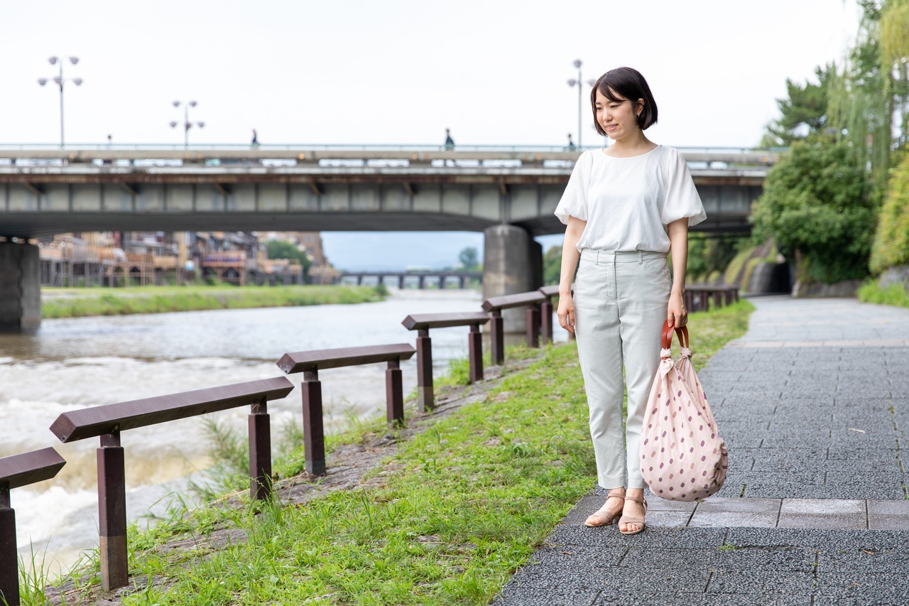 きょうくるみやお持ちの風呂敷にレザーハンドルをつけるとアクセントになり、お洒落なバッグに早変わりします。